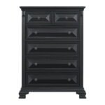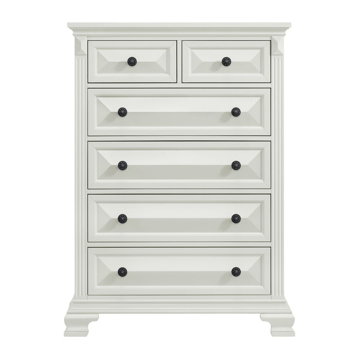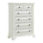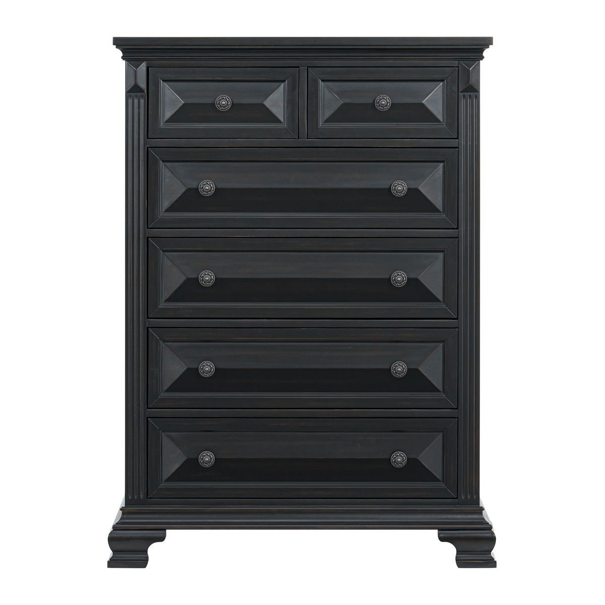 The Bridgestone 6-Drawer Chest is the perfect addition to any bedroom. This case piece is designed with beautiful beveled design throughout, adding a touch of elegance to your decor. The finish features faint distressing for a unique look, while the metal knob hardware adds a contrasting touch. The top drawers are lined with felt to protect delicate items, while the bottom drawer features cedar veneer for added durability. With ball bearing drawer guides and an anti-tipping kit included, this chest is as functional as it is stylish. Bring sophistication and organization to your bedroom with this piece from the Bridgestone collection.