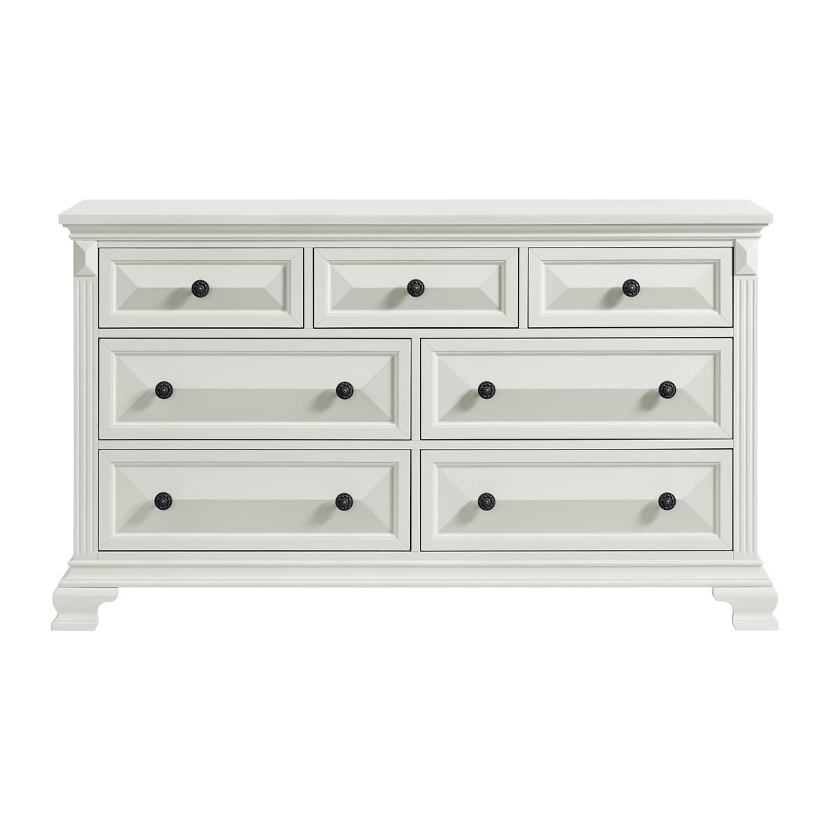 The Bridgestone 7-Drawer Dresser is the perfect addition to any bedroom. This case piece is designed with beautiful beveled design throughout, adding a touch of elegance to your decor. The finish features faint distressing for a unique look, while the metal knob hardware adds a contrasting touch. The top drawers are lined with felt to protect delicate items, while the bottom drawers feature cedar veneer for added durability. With ball bearing drawer guides and an anti-tipping kit included, this dresser is as functional as it is stylish. Bring sophistication and organization to your bedroom with this piece from the Bridgestone collection.