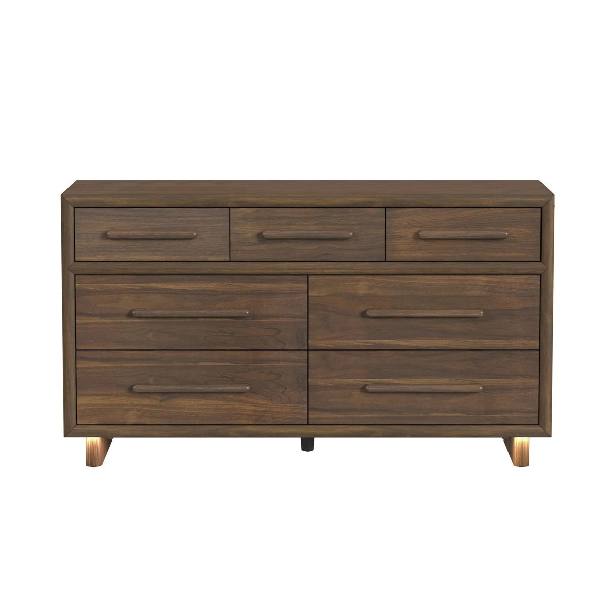 Adorn your bedroom with the charming mid-century modern style of the Brisbane Dresser with LED. Crafted from solid wood and a high-quality walnut veneer, this dresser is as durable as it is stylish. Spacious drawers offer ample space for storing your essentials, and top-row drawers with protective felt lining and a jewelry tray reflect thoughtful design. Minimalist, wood drawer handles and a double pedestal base add charming detail, while LED lighting enhances the piece’s visual aesthetic. For a timeless, durable, and stylish addition to your bedroom, the Brisbane Dresser with LED is an ideal choice.