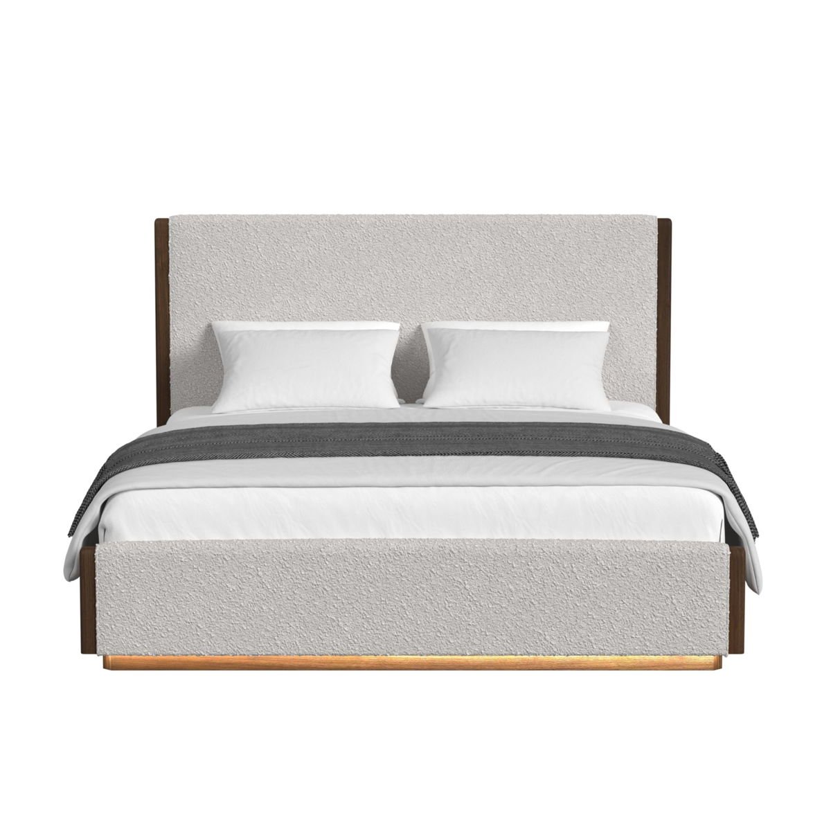 Elevate your bedroom with the refined charm of the Brisbane Upholstered Bed. Crafted from solid wood with a rich walnut veneer, this bed showcases clean mid-century modern lines and sophisticated simplicity. The headboard and footboard are upholstered in soft, beige boucle, adding a layer of texture and warmth to the sleek wooden frame. The low-profile design maintains a grounded, modern look, while the footboard’s LED Lighting invites relaxation. With its timeless design and thoughtful craftsmanship, the Brisbane Upholstered Bed adds enduring style and comfort to your bedroom.