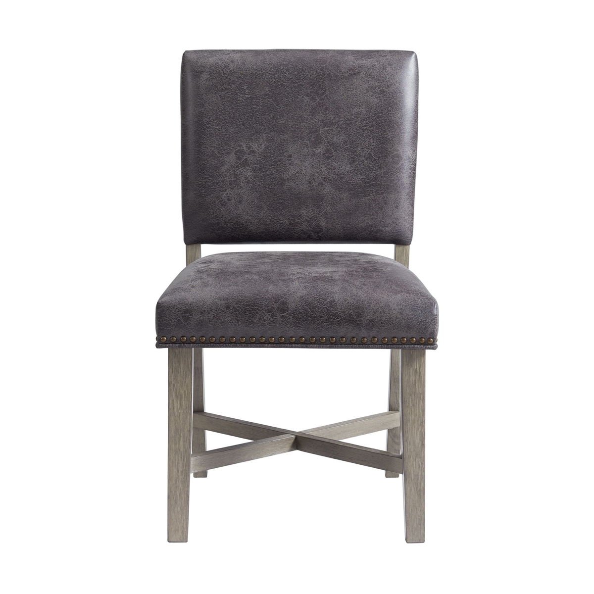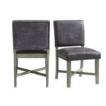 The Collins Dining Side Chair Set emits vintage style and will be the focal point of your dining room. Designed with acacia, rubberwood, and upholstered in a grey faux leather fabric. The base is supported by four distressed wooden legs and sturdy cross-shape stretcher. The faux leather upholstery gives the dining chairs a trendy, vintage tone while the nail head trim completes the look. Ships two chairs in one box for easy handling,