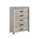 The Ellen 5-Drawer Chest in White is the perfect addition to your bedroom. Crafted of solid wood, mdf, and plywood in a ash white finish. Exposed wood grain detailing and fashioned with rustic-inspired distressing for character. Beautiful black drawer pulls for a modern approach to a rustic look. Features five drawers and dust proofing at bottom drawer for protecting your clothing from dust. The Ellen 5-Drawer Chest has a natural-looking aesthetic, perfect for any farmhouse or transitional style bedroom.