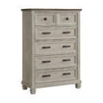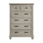 The Farmington 5-Drawer Chest is a beautifully designed piece of furniture constructed of poplar wood with acacia veneer. It boats a stylish two-tone design in medium brown and washed stone that will complement any bedroom decor. The chest also features top drawers with brown felt lining and cedar lined bottom drawers for ample storage space. Complete with handle and knob metal hardware, ball bearing drawer guides, and French and English dovetail construction, this case piece is not only stylish but also functional. The anti-tipping kit adds extra safety measures to this beautiful furniture piece. Upgrade your bedroom with the Farmington collection today!