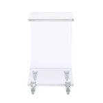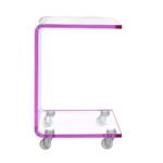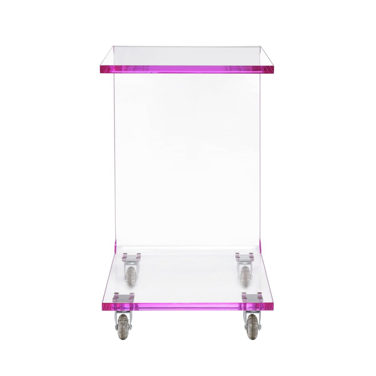 The Iris Acrylic Snack Table is the missing piece to your home! This table comes on clear casters. Dont worry if casters arent your style, they can easily be removed. Roll this snack table with ease up to your sofa and find a spot for your drinks and snacks while you binge watch your favorite shows. The shelf on the bottom lets you add your personal style with any of your favorite decor. The entire table is made out of clear acrylic, making it permanent staple in your home year after year.
