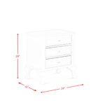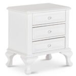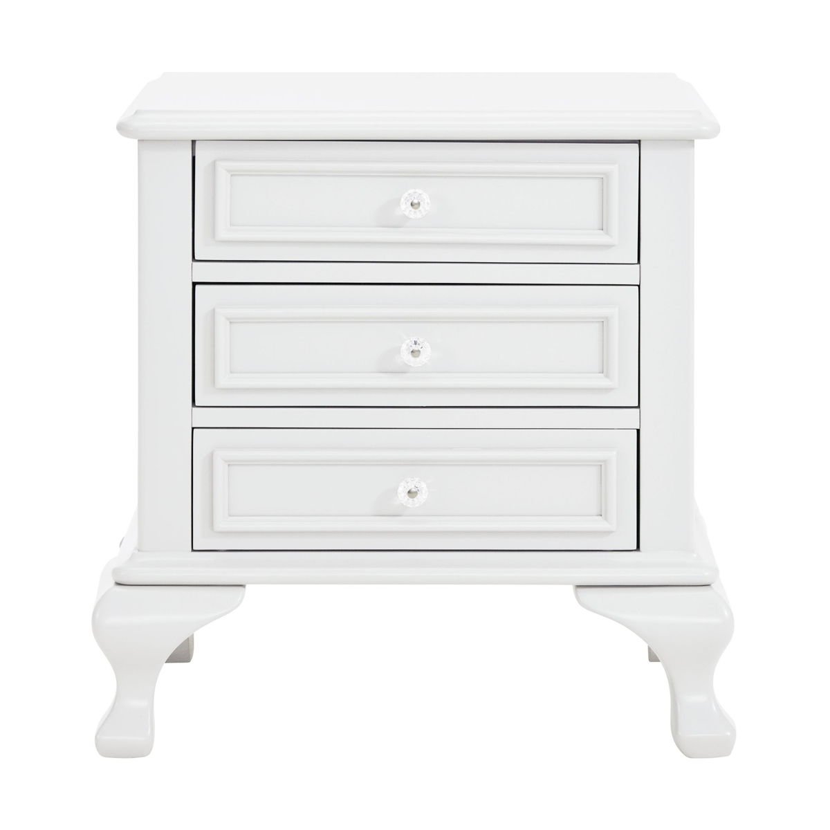 The Jesse Nightstand features a charming design with delicate accents. Keep your little one organized with its three drawers. Perfect for storing all their special belongings. Raised panel drawer fronts are accompanied by crystal-like drawer knobs, adding an extra element of style to this already stylish set. The finish is easy to match with any existing decor. Bevel edges and arched cabriole feet complete the look of this transitional design.