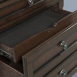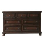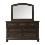 The dresser features seven spacious drawers, and one hidden in the top middle. An arched, bevel edge mirror completes this set.