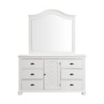 The Kona Dresser and Mirror Set is a stylish and functional addition to any bedroom. This set includes a dresser with a curved mirror top, drawers, and adjustable shelf cabinet storage. The chevron pattern detail on the cabinet door front adds a touch of elegance, while the black knob and cup pull hardware give it a modern look. The top drawers are lined with felt to protect your belongings, and the dust-proofing bottom layer ensures that your items stay clean. With Kenlin drawer guides, bun feet for stability, and an included anti-tipping kit for safety, the Kona Dresser and Mirror Set is both practical and chic.