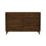 Decorate your nursery with the mid-century modern style of the Malia 6-Drawer Dresser. Built with solid poplar wood with a quality walnut veneer, this dresser doubles in function as a changing table. Six spacious drawers provide ample space for storing your baby’s essentials, while English dovetailing and smooth ball bearing drawer glides mark skillful craftsmanship. Sleek, brass colored metal handles and distinctly tapered feet add charming detail, while an included anti-tip kit enhances safety. For a durable, versatile, and stylish addition to your child’s nursery, the Malia 6-Drawer Dresser delivers.