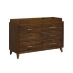 Decorate your nursery with the mid-century modern style of the Malia 6-Drawer Dresser and Topper. Built with solid poplar wood with a quality walnut veneer, this dresser doubles in function as a changing table. Six spacious drawers provide ample space for storing your baby’s essentials, while English dovetailing and smooth ball bearing drawer glides mark skillful craftsmanship. Sleek, brass colored metal handles and distinctly tapered feet add charming detail, while an included anti-tip kit enhances safety. For a durable, versatile, and stylish addition to your child’s nursery, the Malia 6-Drawer Dresser and Topper delivers.