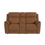 The Mustang Power Motion Loveseat outfits your living space with unmatched comfort. Fully upholstered in 100% top-grain leather and amply padded with soft foam cushioning, this piece is designed to elevate your moments of repose. Power recline, headrest, and lumbar function combine to enhance comfort, while an integrated controller with a USB port and a storage console with 2 metal cupholders add modern convenience. Minimal decorative tufting and stitchwork add refined stylistic elements, perfectly complementing the understated, timeless design. For a comfortable and durable addition to your living space, choose the Mustang Power Motion Loveseat.