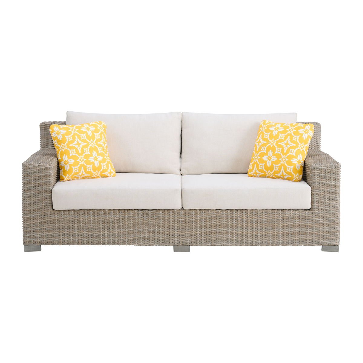The Ollie Sofa patio furniture piece just made your backyard experience a little more inviting. Crafted with a powder coated frame, this outdoor sofa promises countless years of cherished memories with its unique half round weave design. You’ll find upholstered cushions and pillows for you to kick back, relax, and gather around for some fresh air. Track arms and straight lines throughout make this Ollie Sofa a transitional piece that will seamlessly blend in with the great outdoors.