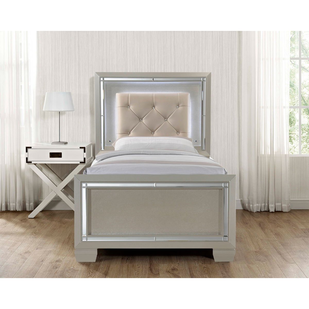 The Platinum Youth Platform Bed is the perfect bed for your glamour queen. Its tufted headboard, mirror glass trim and chic finish will delight for years to come. An underbed trundle completes the bed.