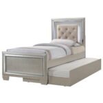The Platinum Youth Platform w/ Trundle Bedroom Set is sure to delight your glamour queen. The mirror glass trim is consistent throughout the collection while the tufted headboard and chic finish complement this group. Complete the look with the underbed trundle.