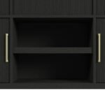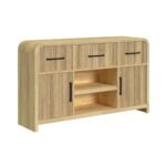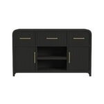 Introduce refined elegance to your dining space with the beautifully crafted Ridgemont Server. The sleek, black tone and gracefully rounded edges create an intriguing silhouette, and textured cabinet fronts add a touch of artful sincerity. Spacious drawers and shelving provide a perfectly organized place for your cherished tableware, allowing you to effortlessly blend practicality with style, while a felt-lined top drawer adds further protection for your most delicate pieces. Let the Ridgemont Server’s timeless design and refined nature be the latest addition to your dining room.