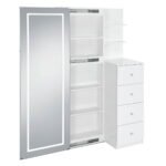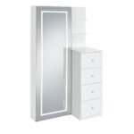 Modern style meets practicality with the Vancouver Floor Mirror with Storage. LED lighting framing the perimeter of the durable tempered glass adds stylistic flair, easily making this mirror a statement piece in your home. The mirror doubles in function as a sliding door, opening to reveal multiple shelves which perfectly complement the adjacent storage drawers and open shelving. Finished in a crisp and versatile white, the Vancouver Floor Mirror with Storage is a functional and sleek addition to your home’s décor.